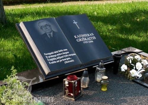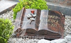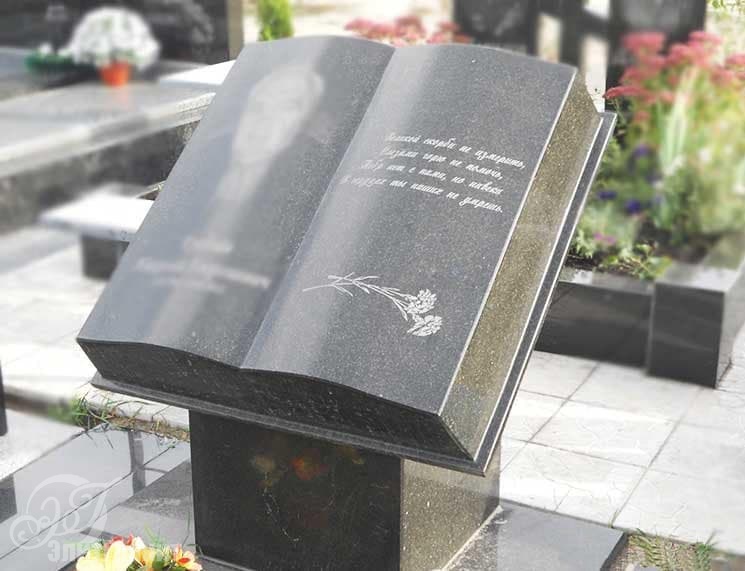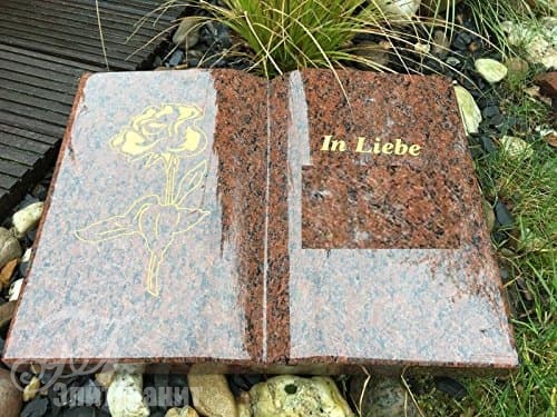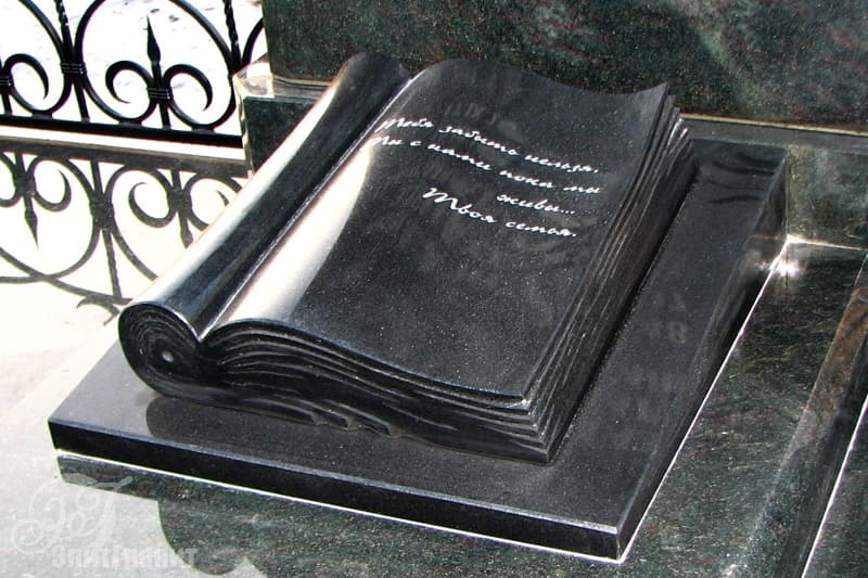 На один разворот гранитной книги можно разместить портрет, а на второй — слова памяти или эпитафию. При втором захоронении в ту же могилу с уже установленным памятником, гранитную книгу можно использовать как второй памятник, что позволяет и сэкономить на новой гранитной стеле, и на блогоустройстве самого захоронения.