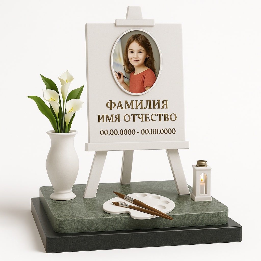 Изысканный памятник, выполненный в форме мольберта, создан в память о девочке, увлечённой рисованием. Сочетание белого мрамора и зелёного гранита придаёт композиции мягкость и гармонию, а символика кистей и палитры подчеркивает творческую натуру ребёнка.