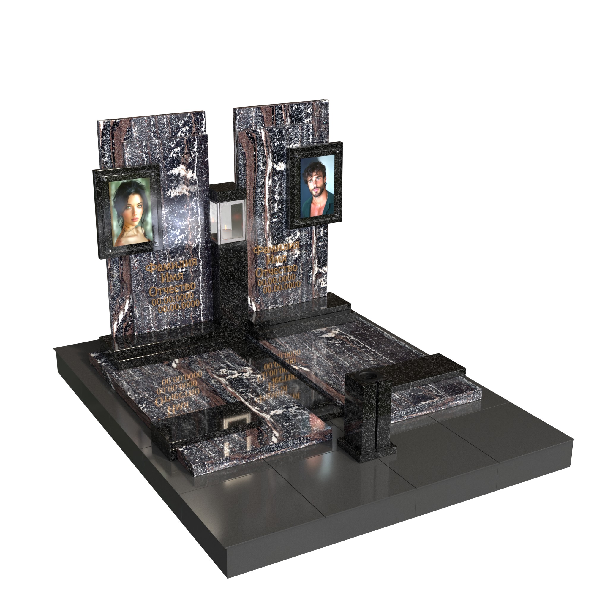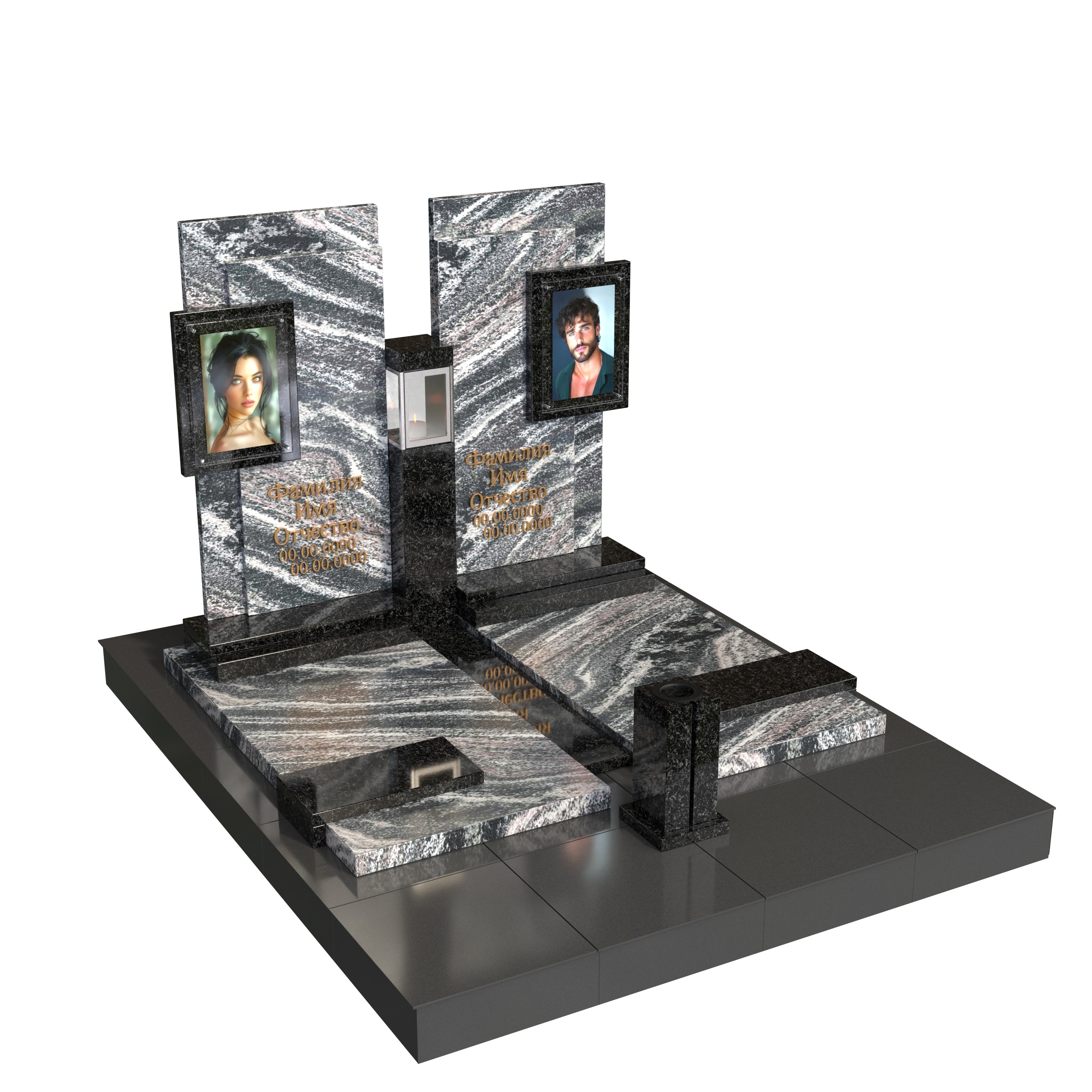 Парный памятник «Единство судеб» — современный мемориальный комплекс для двух захоронений. Две симметричные стелы из натурального камня образуют единую архитектуру, символизируя связь и поддержку на протяжении всей жизни. В каждой стеле — фотопортрет на стекле (крепление на метизах) и индивидуальная гравировка. Центральная лампада и единое основание подчёркивают торжественность и завершённость композиции; предусмотрено место под цветник и аксессуары.