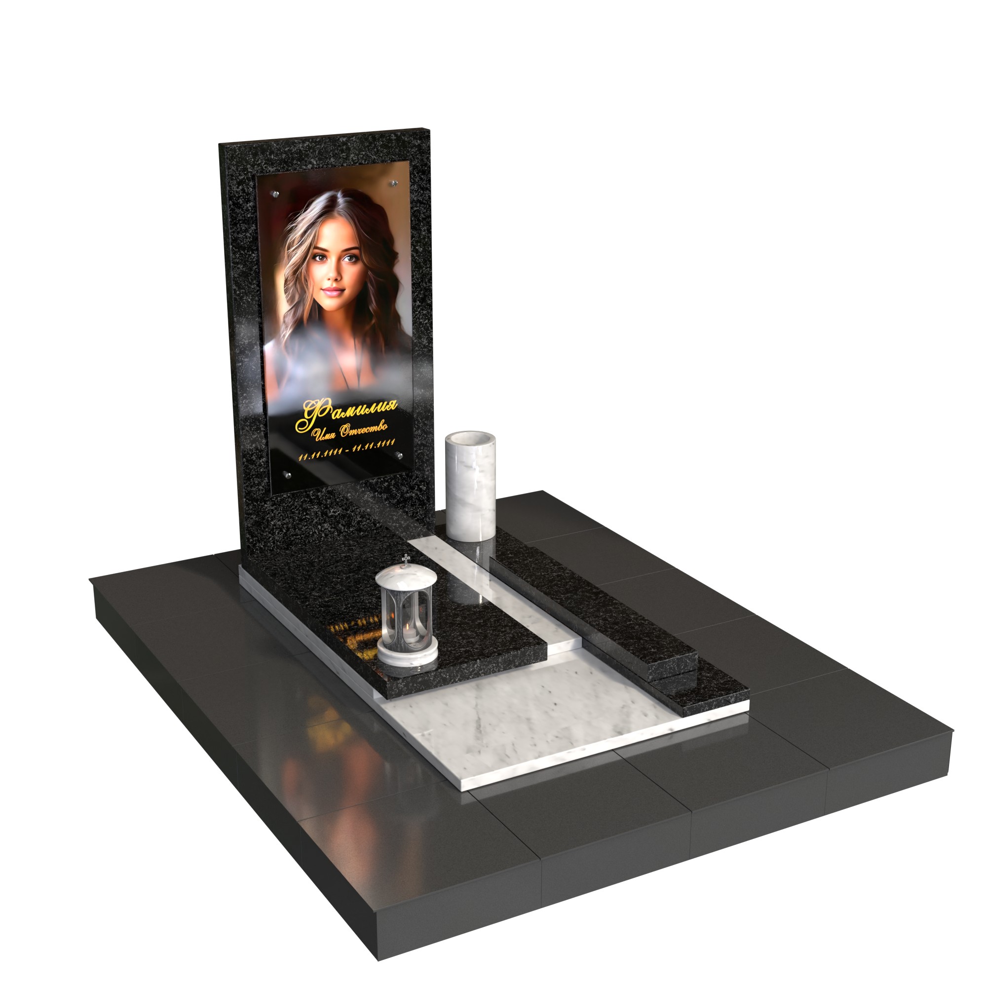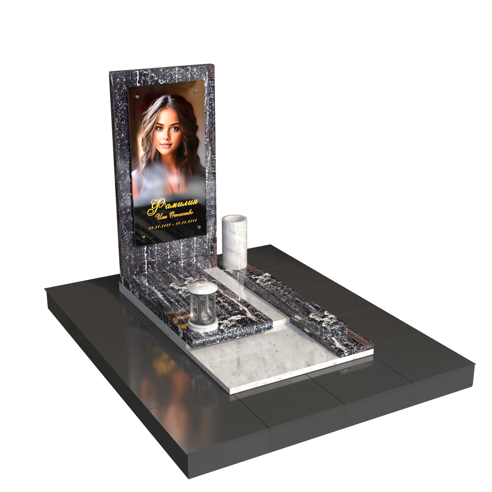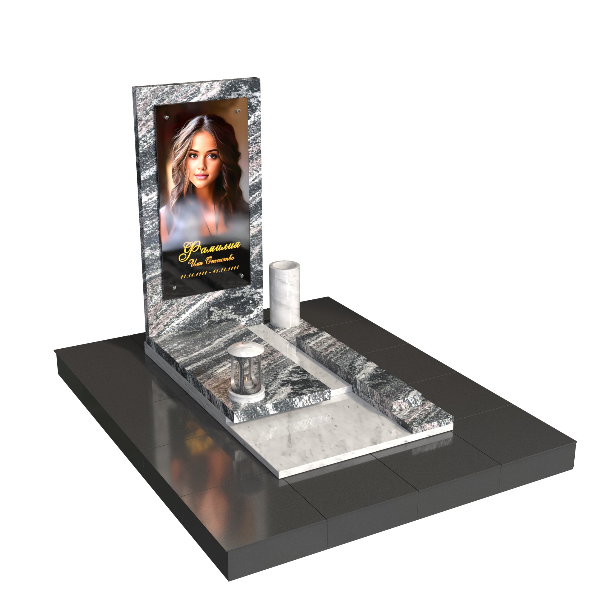 Памятник «Линия света» — современная модель из натурального камня с лаконичной вертикальной стелой и фотопортретом на стекле (крепление на метизах). Контраст фактур и чёткая геометрия придают композиции глубину, а светлый подиум-цветник со ступенью аккуратно зонирует пространство. Комплект дополняют цилиндрическая ваза и лампада, формируя завершённый и ухоженный вид места захоронения.