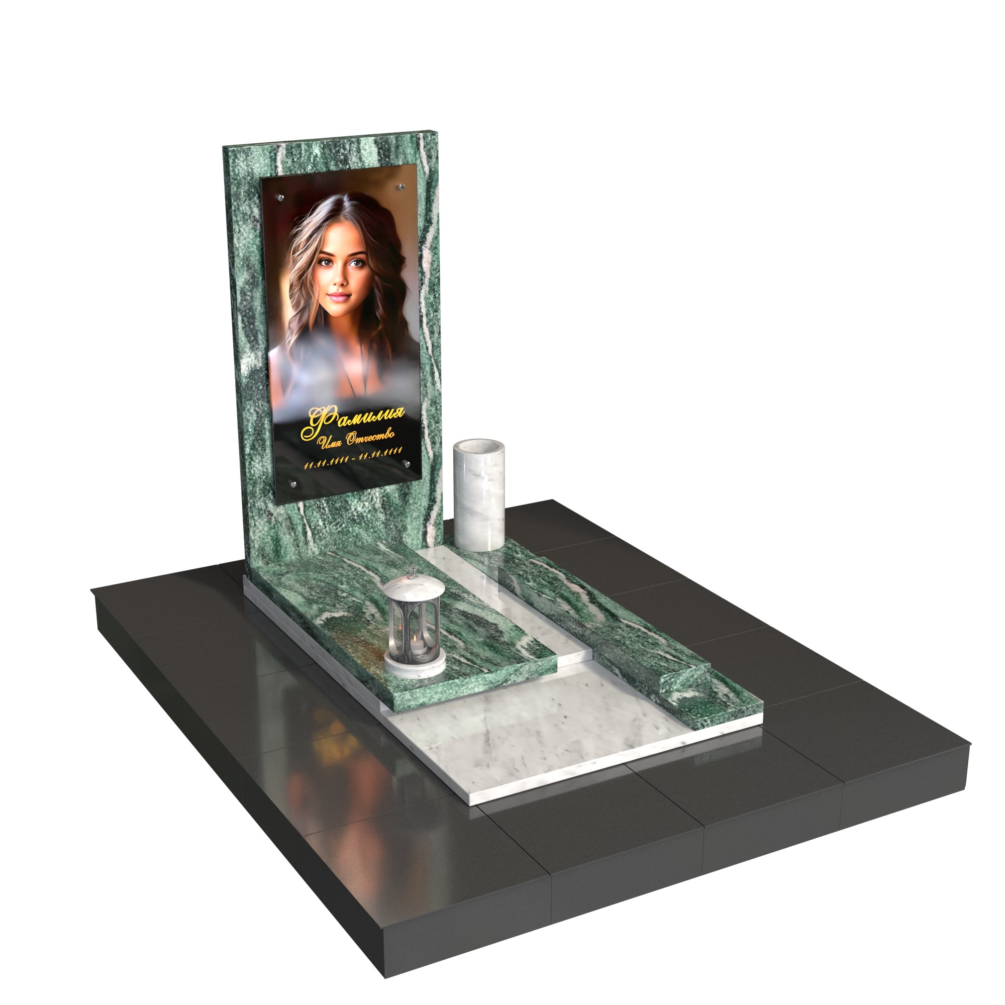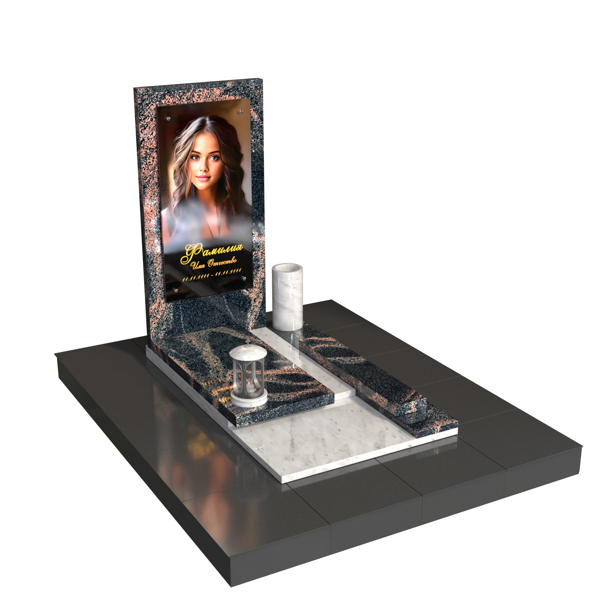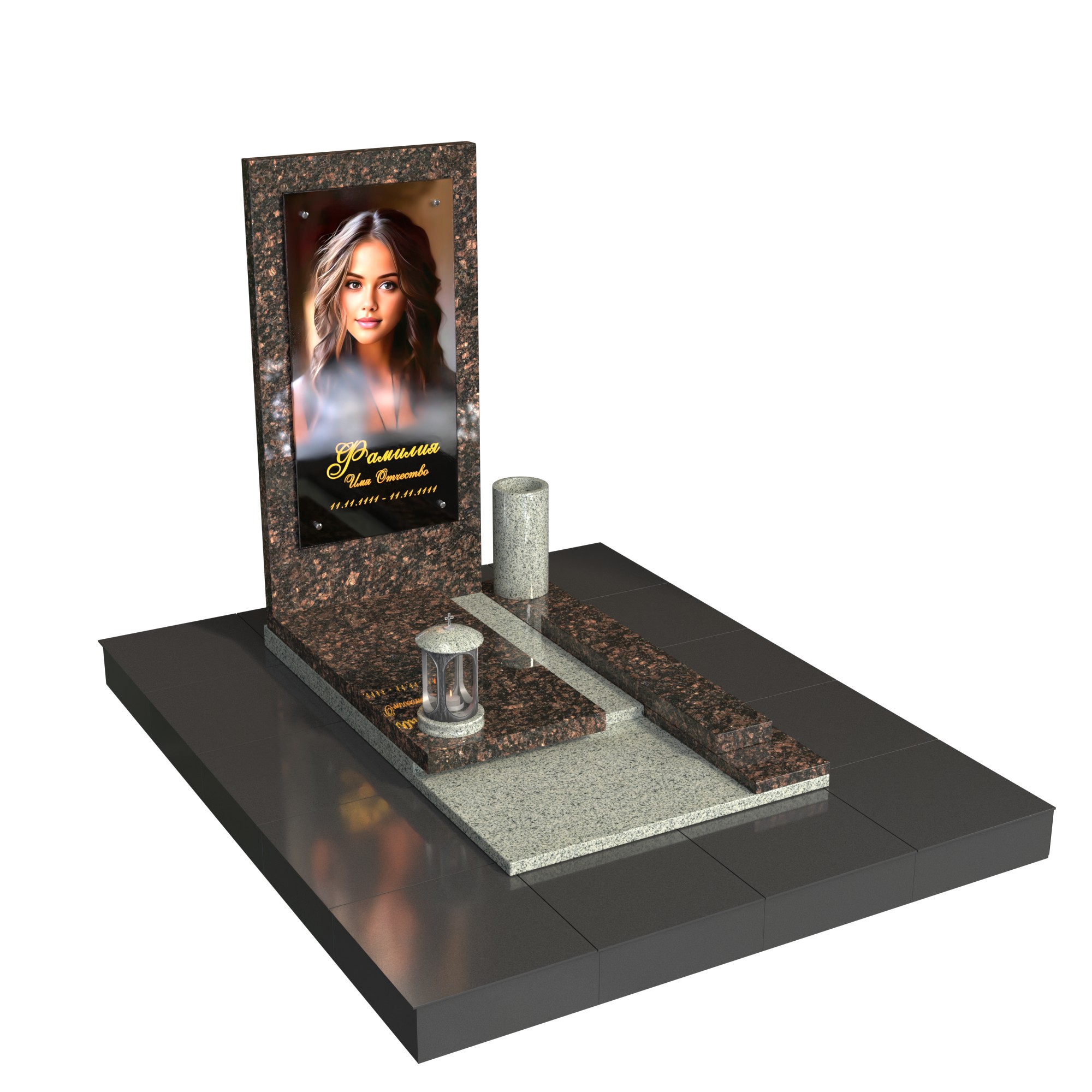 Памятник «Линия света» — современная модель из натурального камня с лаконичной вертикальной стелой и фотопортретом на стекле (крепление на метизах). Контраст фактур и чёткая геометрия придают композиции глубину, а светлый подиум-цветник со ступенью аккуратно зонирует пространство. Комплект дополняют цилиндрическая ваза и лампада, формируя завершённый и ухоженный вид места захоронения.