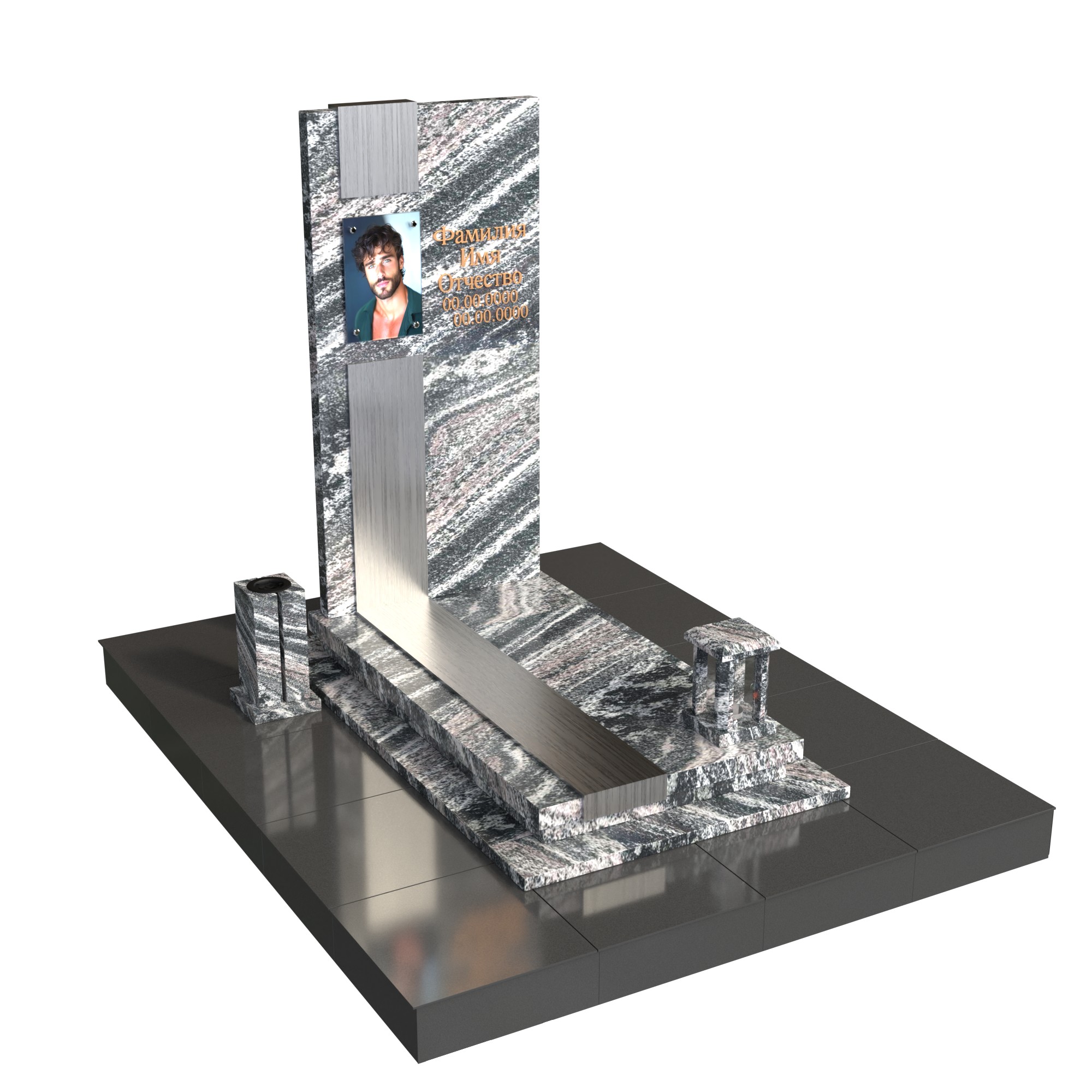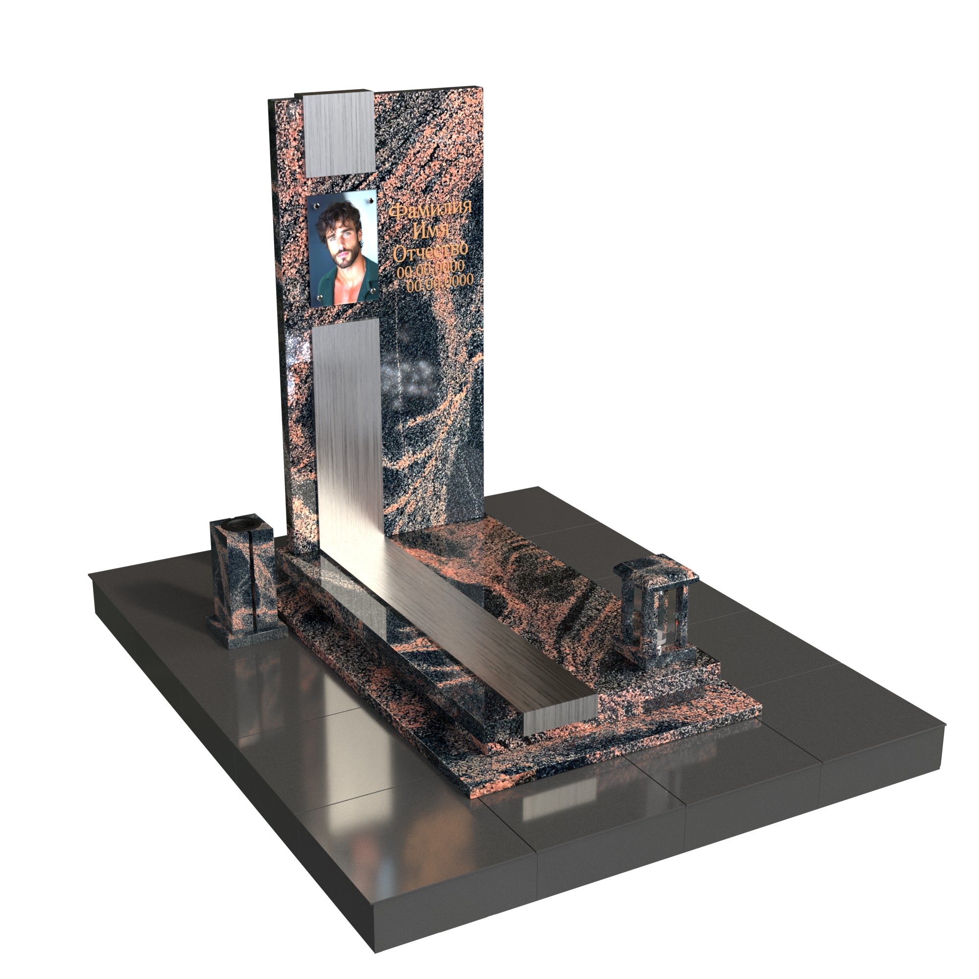 Фактурный камень с выразительной природной текстурой придаёт композиции глубину и динамику, а контраст с металлическим элементом усиливает ощущение вечности. Портрет размещён на стекле и гармонично вписан в архитектуру памятника. Ваза и лампада выполнены в едином стиле, подчёркивая завершённость образа.