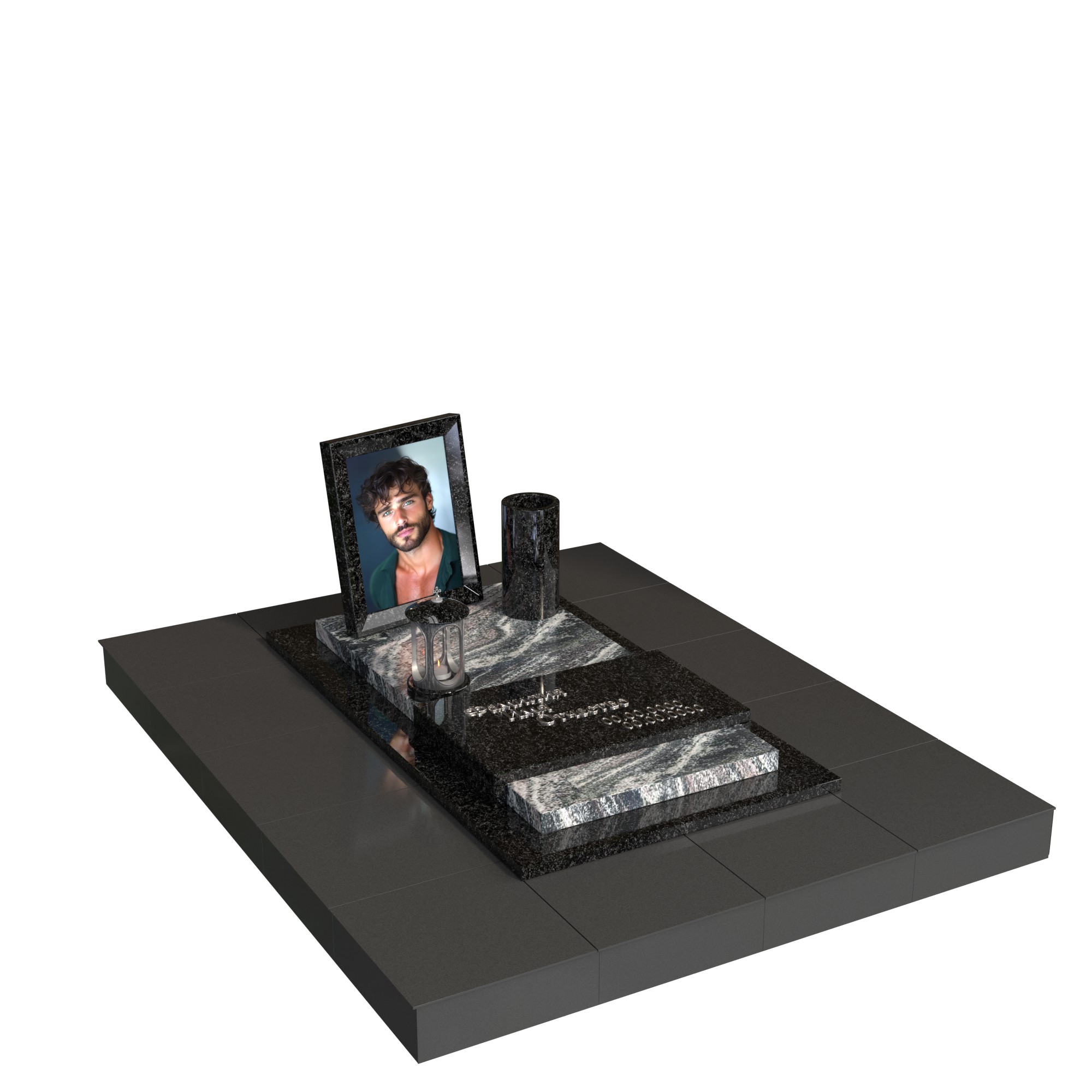 Памятник «Тихий отклик» — компактный горизонтальный мемориал из натурального камня с аккуратной архитектурой и продуманным благоустройством. Наклонная каменная фоторамка делает образ особенно живым, а двухуровневая плита с контрастной вставкой подчёркивает аккуратность и порядок на участке. Композицию дополняют цилиндрическая ваза и лампада, объединённые в едином стиле.