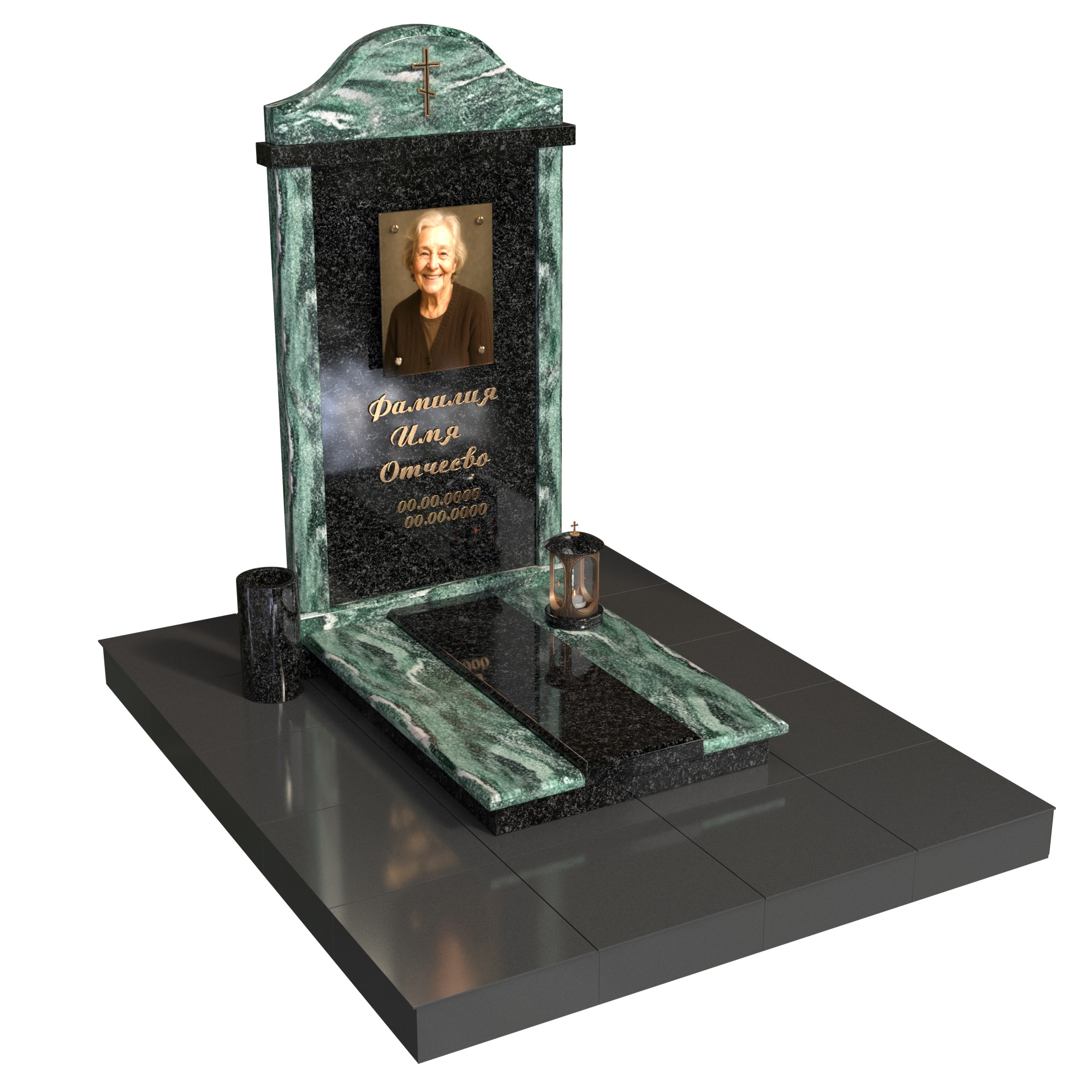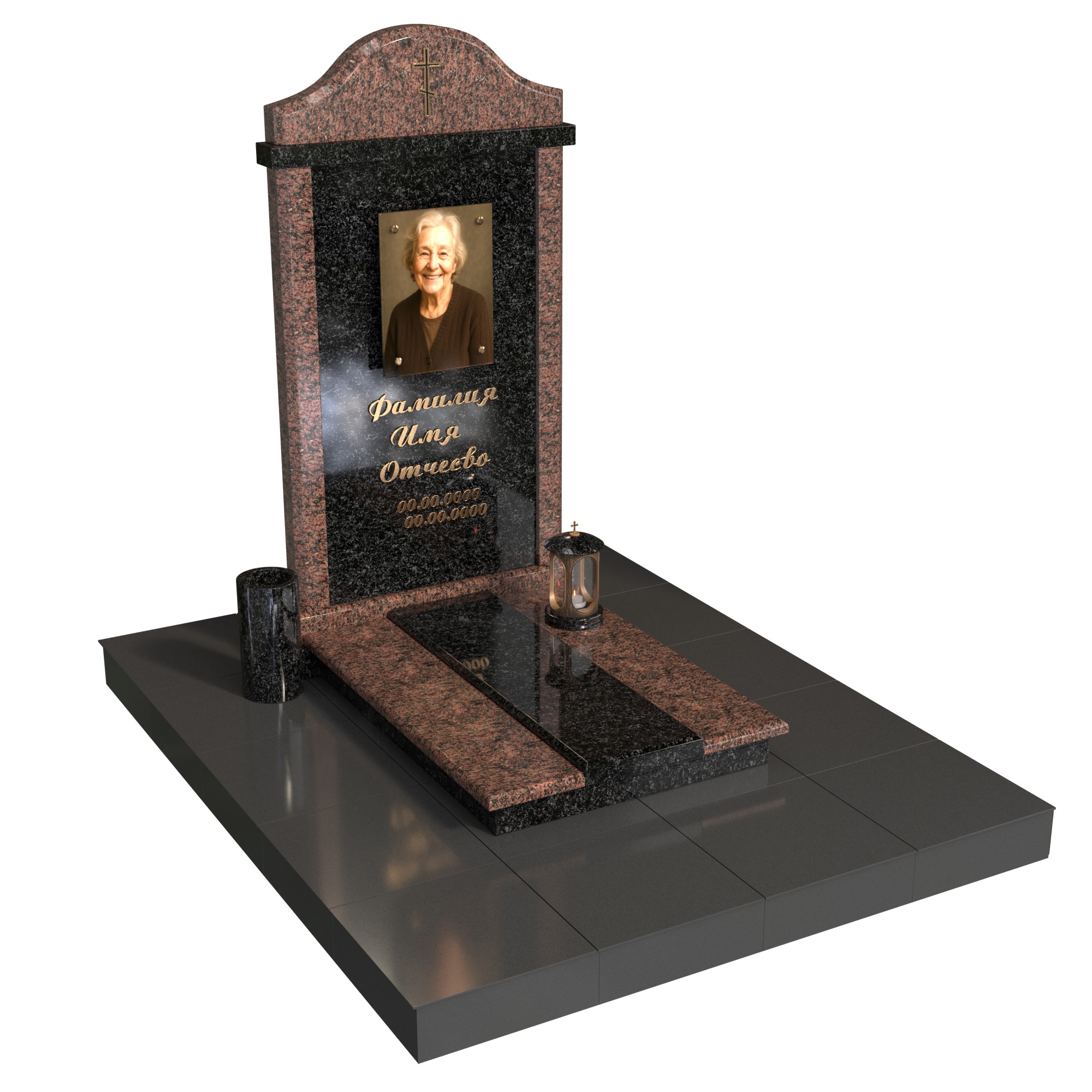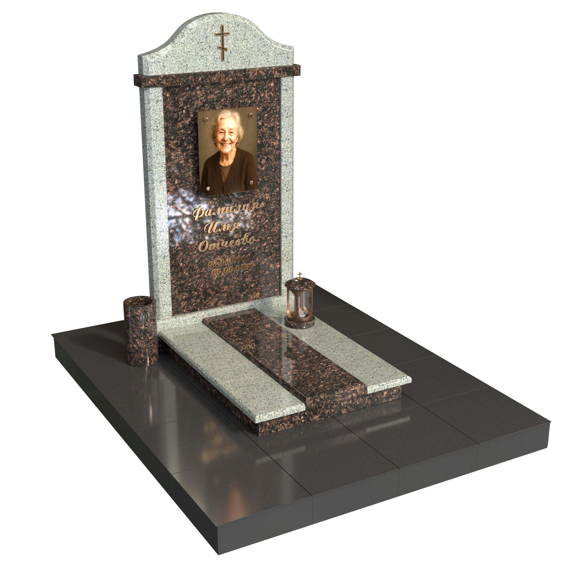 Парный памятник «Столп семьи» — элегантный семейный комплекс для двух захоронений. Две строгие стелы объединены центральной колонной с крестом, символизирующей опору и единство. В каждой стеле — фотопортрет на стекле и индивидуальная гравировка. Фигурное основание и аккуратная плита придают комплексу завершённый, ухоженный вид; предусмотрено место под лампаду и аксессуары.