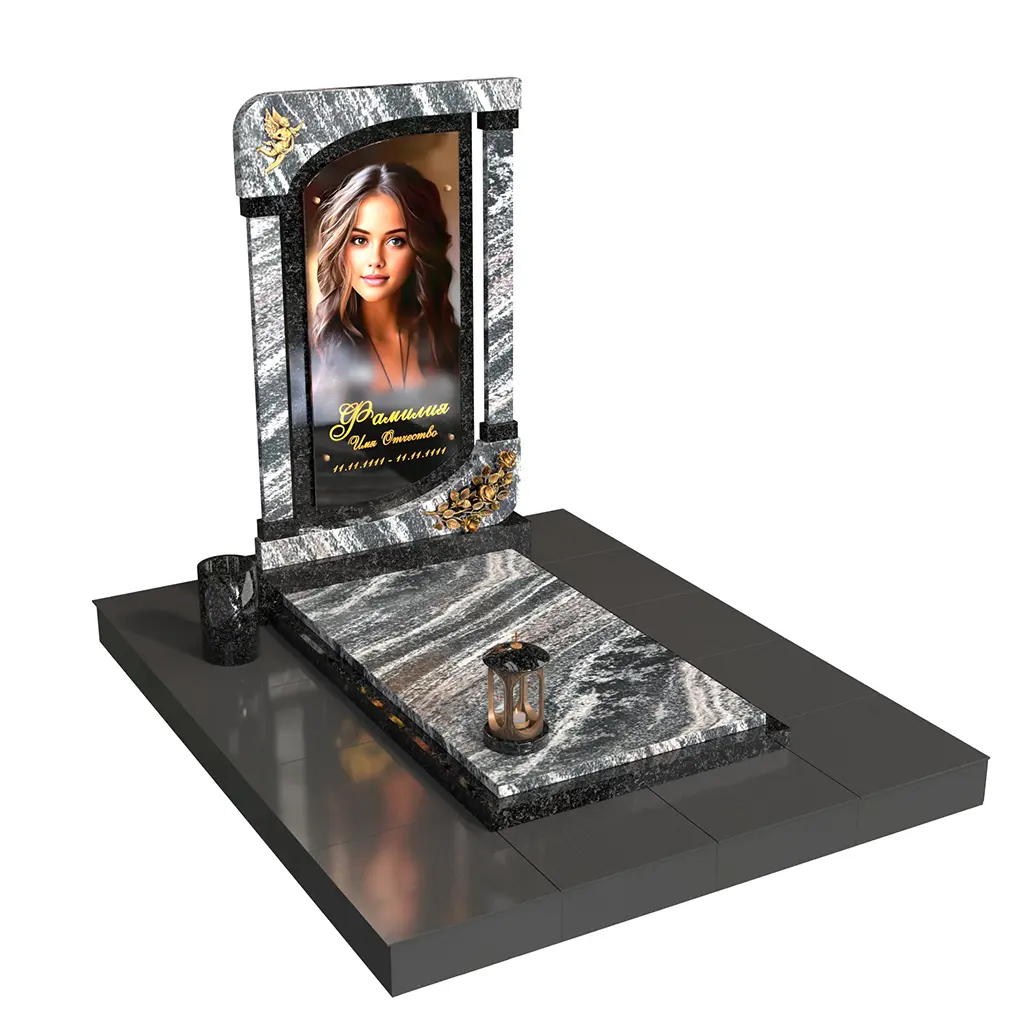 Контрастная структура натурального камня подчёркивает выразительность силуэта, а утончённый декор из бронзы в виде цветочной ветви и птицы символизирует лёгкость души и вечную любовь. Надгробная плита повторяет ритм камня, создавая гармоничное визуальное единство. Бронзовая лампада и аккуратная ваза завершают композицию.