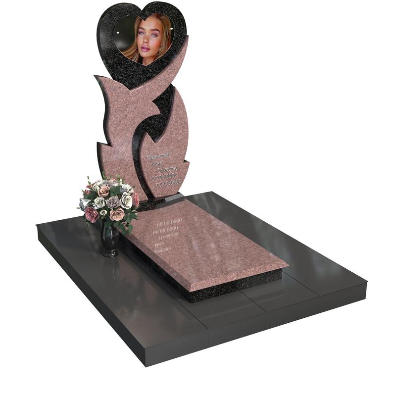 Тёплый розовый гранит Винга придаёт памятнику мягкость и индивидуальность, а глубокий чёрный габбро-диабаз подчёркивает контраст и устойчивость. В центре композиции — сердце, в которое встроен фотопортрет на стекле, как знак глубокой связи и вечной памяти. Надгробная плита и основание выполнены в едином стиле, что придаёт комплексу завершённый и выразительный облик.